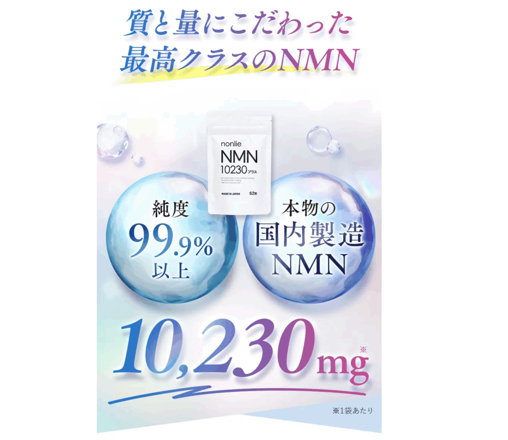 nonlie NMN10230プラスは、国内製造の高純度NMNを贅沢に10,230mg配合したハイグレードサプリ。